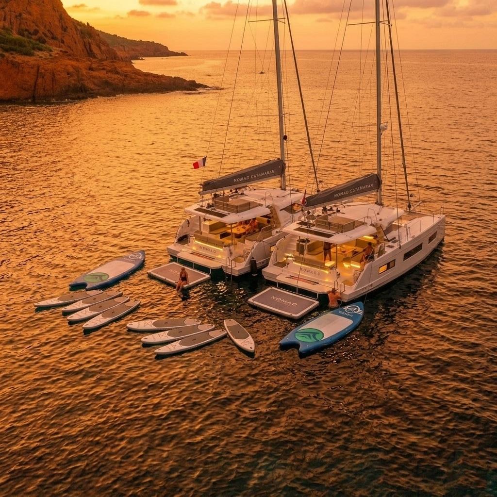 Embark on a magical evening aboard our spacious NOMAD3 and NOMAD4 catamarans, with professional skipper, and let yourself be enchanted by the beauty of the Lérins Islands at dusk. Join us for an exceptional half-day (5:30-9:30 pm) and enjoy an unforgettable experience on the Côte d’Azur. Our professional skipper will guide you through the colorful waters of the Mediterranean.